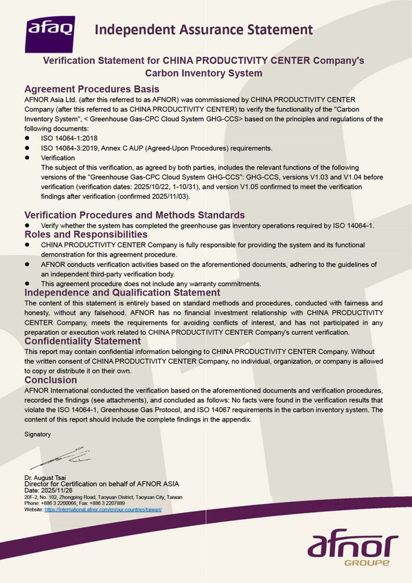 本中心自主開發之「溫室氣體盤查雲端填報系統GHG-CCS」通過第三方法標國際認證,並於114年11月26日取得「獨立保證意見聲明書」。